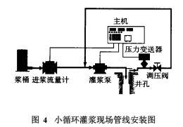 小循環(huán)灌漿法的實質(zhì)是: a泵的吸入量主要由返漿量提供,返漿量的大小由高壓調(diào)節(jié)閥控制,鉆孔灌漿注入量=流量計量(見圖4);b流量計大部分時間工作在1/3量程之下,相當長的時間內(nèi)工作在1L/min左右;c返漿漿液不返回攪漿桶,水泥漿液只能在閉合的管道中循環(huán),漿桶內(nèi)調(diào)節(jié)水灰比對灌漿漿液的密度影響甚微。