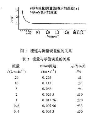 由EMF的測量原理可知,其流量的下限由同噪聲或偏移的信噪比S/N 來決定,其上限則由測量管內(nèi)襯里的磨損和配管的經(jīng)濟速度等來決定。一般當測量管內(nèi)實際流速小于0.1m/s時,感應電動勢已變得十分微弱(幾微伏至零點幾微伏),此時噪聲的影響逐步變?yōu)橹鲗?,甚至淹沒信號電動勢。其流速和測量誤差的關(guān)系詳見圖 5和表2。