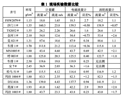 現(xiàn)場(chǎng)試驗(yàn)所用測(cè)量管的內(nèi)徑為DN50,通過高壓由壬接入泥漿管線,并串接渦輪流量計(jì)進(jìn)行比較,采用標(biāo)準(zhǔn)計(jì)量罐測(cè)試。計(jì)量鉆井泥漿密度范圍為1.15g/cm³~2.50g/cm³,固井設(shè)計(jì)施工現(xiàn)場(chǎng)一次性替漿量為18m³~160m³,替漿瞬時(shí)流量為0.2m³/min~2.8m³/min(流速:1.6~23.8m/s);通過近15口井的施工應(yīng)用,結(jié)果如表1所示。試驗(yàn)表明儀表計(jì)量誤差小于1%;在流速2.0m/s以下,隨著流量的減少測(cè)試誤差逐漸提高,在流速1.0m/s左右計(jì)量精度降到3%左右。經(jīng)分析,主要是由零點(diǎn)漂移引起的,這點(diǎn)與實(shí)驗(yàn)室用清水標(biāo)定結(jié)果基本吻合。使用DN50的測(cè)量管,實(shí)驗(yàn)室標(biāo)定結(jié)果如表2所示。試驗(yàn)證明,采用雙頻矩形波作為勵(lì)磁信號(hào),可有效地規(guī)避和抑止固井泥漿的流動(dòng)噪聲和現(xiàn)場(chǎng)震動(dòng)等所帶來的低頻噪聲,從而顯著提高儀表計(jì)量泥漿的精度。