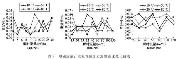 將實驗測得的耐腐蝕排污管道流量計在不同溫度及流速下的重復(fù)性數(shù)據(jù)整理,特性曲線如圖2所示,3組曲線分別對應(yīng)DN40、DN80、DN100的3塊耐腐蝕排污管道流量計的重復(fù)性曲線。