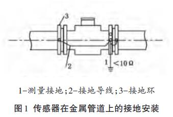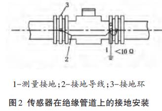 傳感器安裝在塑料管道或內(nèi)壁有絕緣涂層、襯里的管道上,兩端應(yīng)安裝接地環(huán)(或帶有接地電極的金屬短管),然后用導(dǎo)線(xiàn)連接,使管內(nèi)流動(dòng)的介質(zhì)與大地短路,具有零電位(見(jiàn)圖2)。