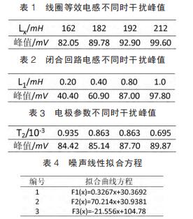 仿真試驗中,設(shè)定線圈等效電感取值范圍為 162~212mH,間隔 10mH;閉合回路等效電感范圍 0.2~1mH,間隔為 0.2mH;雙電層電容、接觸電阻隨流體電導(dǎo)率變化而變化,電導(dǎo)率增大接觸電阻和雙電層電容減小而電荷傳遞電阻增大。可設(shè)定電極接觸電阻、雙電層電容和電荷傳遞電阻范圍分別為 5~15kΩ、10~20μF 和50~60Ω,由公式(7)知,可用 T2 表示上述三者關(guān)系。 仿真參數(shù)取值不同情況下,通過 MATLAB 工具箱對仿真測量得到的干擾峰值進行曲線擬合畫出相應(yīng)的曲線圖。 其中仿真數(shù)據(jù)和相對應(yīng)的曲線方程如表 1~表 4 所示,曲線圖如圖 4~圖 6。