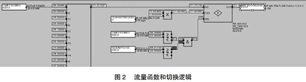 但是由于近期趨勢可能收集不到部分負(fù)荷段的相關(guān)數(shù)據(jù),在超出現(xiàn)有數(shù)據(jù)負(fù)荷的部分應(yīng)采取必要的補(bǔ)救措施,可以參考相同負(fù)荷運(yùn)行的另一臺(tái)余熱鍋爐的主蒸汽流量,以此來彌補(bǔ)現(xiàn)有數(shù)據(jù)的不足。為了保證數(shù)據(jù)切換的可靠性,切換條件要嚴(yán)謹(jǐn),現(xiàn)有函數(shù)的負(fù)荷下線上增加25MW與另外一臺(tái)的燃機(jī)負(fù)荷大于100MW。如此設(shè)置的好處是當(dāng)另一臺(tái)運(yùn)行機(jī)組突然故障或跳機(jī)時(shí)保證數(shù)據(jù)能及時(shí)切換到函數(shù)輸出,保證機(jī)組的安全運(yùn)行。具體操作見圖2。