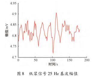 在頻域中對紙漿信號觀察時發(fā)現(xiàn),紙漿信號的漿液噪聲頻帶在零頻率點附近,距離流量信號基波頻率點較遠,對基波幅值和各奇次諧波幅值基本沒有影響,紙漿信號在頻域中的圖形如圖7所示。選擇一組采集的紙漿信號,把其等分成數(shù)段,利用MATLAB計算每段數(shù)據(jù)在基波處的幅值并提取保存在一個數(shù)組中,使用繪圖工具畫出來,如圖8所示??梢?,基波幅值在4.7~4.95mV變化,波動較小。因此,提取到的與流量相關(guān)的感應(yīng)電動勢信號幅值會比較穩(wěn)定。
