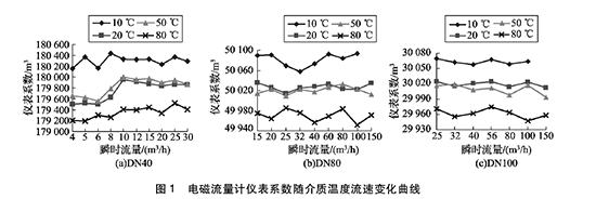以山東省計(jì)量院DN50一D N400熱水流量標(biāo)準(zhǔn)裝置為實(shí)驗(yàn)平臺,管道污水處理進(jìn)出水口流量計(jì)共3塊,分別為橫河DN40管道污水處理進(jìn)出水口流量計(jì),科隆DN80管道污水處理進(jìn)出水口流量計(jì),西門子DN100管道污水處理進(jìn)出水口流量計(jì),精度均為0. 2級。3塊管道污水處理進(jìn)出水口流量計(jì)經(jīng)過多次校準(zhǔn)比對,性能穩(wěn)定。對管道污水處理進(jìn)出水口流量計(jì)在10, 20, 50, 80 ℃ 4個(gè)溫度點(diǎn)下進(jìn)行儀表系數(shù)及重復(fù)性測量,根據(jù)JJG 643-2003標(biāo)準(zhǔn)表法流量標(biāo)準(zhǔn)裝置》的要求選取流量點(diǎn)3。