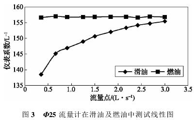 依據(jù)表3測(cè)試數(shù)據(jù),經(jīng)計(jì)算可得,Φ25流量計(jì)在滑油及燃油中測(cè)試結(jié)果如表4所示,測(cè)試線形圖如圖3所示。