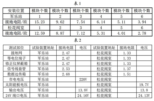 接地網(wǎng)的安裝與連接:接地網(wǎng)是整個重油流量計防雷試驗比較關(guān)鍵的一個內(nèi)容,能不能準確的論證試驗的有效性,必須保證接地網(wǎng)達到標準的接地電阻,通過對實地地電阻率的測試,初步選擇6個接地模塊埋設(shè)并配用降阻劑使用,邊安裝邊測試直到達到標準值后才引入等電位箱。在軍樂站和松花閥室安裝模塊并測試數(shù)據(jù)見表1。