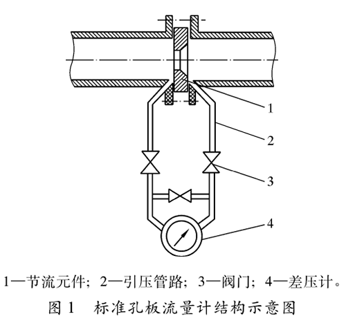 標準管道煙氣流量計結構如圖1所示,包括節(jié)流元件(標準孔板及其取壓裝置)、傳輸壓差信號的引壓管路、閥門以及差壓計等部分。標準孔板是壓差測量時的一次元件,人們利用它在管道內(nèi)使流體產(chǎn)生壓差,再通過引壓管路把孔板前、后產(chǎn)生的壓差傳送給差壓變送器,再輸人到二次儀表,從而顯示出管道內(nèi)流體的靜壓、壓差、瞬時流量和累計流量等計量參數(shù)。