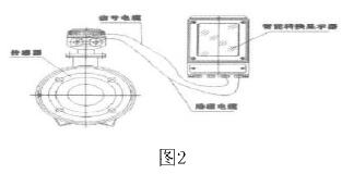 一體型管道污水流量計(jì)是由流量傳感器和轉(zhuǎn)換器(也叫顯示器)兩大部分組成。測量管上下裝有激磁線圈,通激磁電流后產(chǎn)生磁場穿過測量管,一對電極裝在測量管內(nèi)壁與液體相接觸,引出感應(yīng)電勢,送到轉(zhuǎn)換器。激磁電流則由轉(zhuǎn)換器提供。如圖2所示: