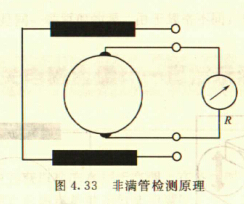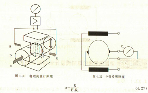 非滿管檢測也是基于電導(dǎo)率檢側(cè)的方法。在圖4.33所示的電磁流量傳感器中,增加了一個(或一對)非滿管檢測電極。當(dāng)導(dǎo)管內(nèi)液體滿管時(shí),頂部電極與其他電極之間的電阻值很小;而當(dāng)存在非滿管情況時(shí),頂部電極與導(dǎo)電液體之間有氣體阻隔,所以電極電阻顯著增大,從而做出非滿管判斷。