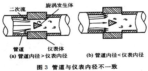 而丙烷流量計與安裝管道內徑也會存在誤差,或大或小,如圖3所示,當被測介質經過時,也會發(fā)生二次流動,對測量結果產生波動影響。