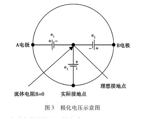在被測液體與電極和接液部件接觸過程中,電解質(zhì)中的正負(fù)離子會(huì)分別作定向運(yùn)動(dòng),這會(huì)使被測液體在電極和接液部件之間形成電位差,通常將這種現(xiàn)象稱為極化現(xiàn)象。如圖3 所示,理論上來說,兩電極A 和B 對接液部件的電位e1、e2大小相等、方向相反,此時(shí)兩電極的電位差等于零。但是,若兩電極的材質(zhì)或表面狀態(tài)存在差異,此時(shí)A、B 電極之間的電位差就不為零,這就形成了極化電壓,極化電壓與共模狀態(tài)的電壓e3一起疊加在流量信號(hào)中,被輸入轉(zhuǎn)換器的差動(dòng)放大器。當(dāng)極化電壓過大,則會(huì)對差動(dòng)放大器的輸入端造成較大影響,導(dǎo)致信號(hào)無法放大或流量信號(hào)的輸出波動(dòng)過大,從而降低了衛(wèi)生型卡箍電磁流量計(jì)的測量精度。