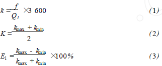 將乙烯流量計在標(biāo)準(zhǔn)水裝置上,分別用頻譜分析和脈沖計數(shù)的方法進(jìn)行標(biāo)定,流體介質(zhì)為水未加氣體,采用的標(biāo)準(zhǔn)傳感器為精度等級為0.2級的電磁流量計。在每個流量測量點上的儀表系數(shù)用公式(1)計算,然后用式(2)計算得到*終儀表系數(shù)K。Ql為被測水的流量值,f為每一個流量點得到的頻率,k為每個測量點得到的儀表系數(shù)。kmax、kmin分別為試驗流量范圍內(nèi)得到的*大與*小的儀表系數(shù)。儀表系數(shù)的線性度E1用式(3)來計算。