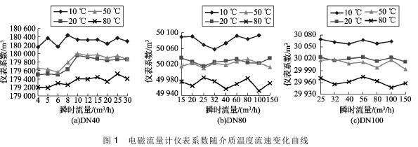 將實驗測得的農(nóng)藥流量計在不同溫度及流速下的儀表系數(shù)數(shù)據(jù)整理,特性曲線如圖1所示,3組曲線分別對應DN40、DN80、DN100的3塊農(nóng)藥流量計的儀表系數(shù)曲線。