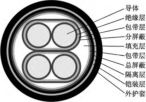 該新型電纜的結(jié)構(gòu)如圖1所示。導體為單股退火鍍錫軟銅線,以提高導體的導電性和防腐蝕性。在導體外繞包一層薄F4(聚四氟乙烯)半導電帶,有利于降低導體和絕緣之間的摩擦起電噪音。絕緣采用材料較為純凈、介電常數(shù)較小、具有一定彈性的聚丙烯絕緣級材料,并采用擠壓式擠出,減小絕緣層與導體的間隙。采用對絞組作為信號傳輸線,由于在兩根傳輸線上感應(yīng)的電壓接近相等,減小了電壓差值,提高了信號傳輸穩(wěn)定性;對絞組由兩種不同顏色絕緣線芯組成,相鄰線對對絞節(jié)距應(yīng)不大于100mm。對絞分屏蔽組(即對對絞組進行分屏蔽,每對對絞組外繞包兩層聚酯帶和一層厚0.04mm鋁塑復(fù)合帶繞包,內(nèi)置一根7×0.26mm鍍錫銅絞線作引流線)有利于對不同對絞組之間信號串音的抑制和隔離。對絞分屏蔽組同心式絞合成纜,在對絞分屏蔽組間填充非吸濕性材料,以保證纜芯圓整。在成纜纜芯外繞包兩層聚酯帶,再采用鋁塑復(fù)合帶繞包,內(nèi)置鍍錫銅線作引流線,以提高電纜電磁屏蔽能力。總屏蔽層外擠包隔離層(隔離護套),隔離層采用絕緣級低密度聚乙烯材料。隔離層外采用鎧裝層,鎧裝材料為高導磁合金鋼帶,其為強磁材料,可將外來的磁通大部分限制在鎧裝層的外表面上(僅有少部分能進入被屏蔽的空間);鎧裝時對高導磁合金鋼帶采用縱包焊接,確保其形成一連續(xù)圓柱管;鎧裝層可提高電纜抗電磁干擾水平以及對電纜進行加強,減少電纜振動引起的電動勢。外護套采用藍色軟PVC(聚氯乙烯)護層級電纜材料擠包,實現(xiàn)電纜防護。