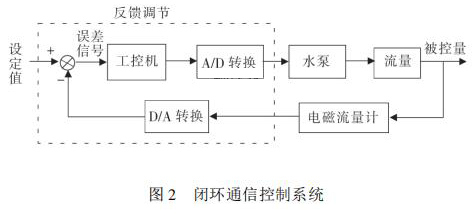 通信控制系統(tǒng)由工控機、變頻器、水泵、數(shù)據(jù)采集卡、化工污水流量計等組成。在整個熱量表耐久性試驗裝置中,化工污水流量計與被試驗熱量表串聯(lián)在試驗管路中。系統(tǒng)設(shè)定流量值 qs,通過工控機發(fā)送信號給變頻器,來控制水泵運轉(zhuǎn),系統(tǒng)通過研華數(shù)據(jù)采集卡 PCI1711 將采集到的化工污水流量計當(dāng)前瞬時流量值反饋給工控機,工控機將返回流量值與設(shè)定流量值qs進(jìn)行比較,從而確定是否需要重新調(diào)整變頻器頻率控制水泵轉(zhuǎn)速。此過程是一個完整的閉環(huán) PID 控制過程,其閉環(huán)控制過程如圖 2 所示。 2. 2 管路切換系統(tǒng)管路切換主要由冷熱水箱、水泵、開關(guān)閥等組成。要實現(xiàn)熱量表耐久性 4000 次冷熱沖擊試驗,需要實時控制管路中熱水與冷水的交替使用。