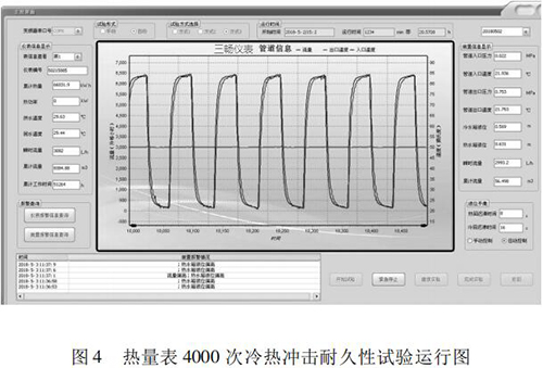 本文研究的 4000 次冷熱沖擊試驗的實現(xiàn)具有以下特點: (1)基于“工控機 +水泵 + 化工污水流量計”的閉環(huán)控制系統(tǒng),實現(xiàn)了流量自動反饋調(diào)節(jié),滿足試驗要求; (2)通過四個開關(guān)閥的時序切換,自動控制試驗溫度,很好的完成了 4000 次溫度沖擊試驗; (3)通過“工控機 + 數(shù)據(jù)數(shù)據(jù)采集卡”的數(shù)據(jù)采集系統(tǒng),實時監(jiān)控試驗過程中的流量、溫度、壓力等相關(guān)參數(shù),實現(xiàn)試驗方式的自動控制,并能對試驗數(shù)據(jù)進(jìn)行分析與評定。 (4)試驗的全過程為智能自動化,可無人員留守看護(hù)。試驗結(jié)果可直接反映出熱量表在長時間運行后的可靠性。為我國熱量表耐久性試驗研究提供檢測手段,為促進(jìn)產(chǎn)品質(zhì)量提升做好技術(shù)保障。