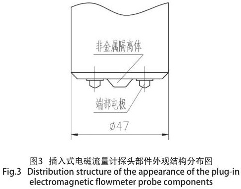 通過大量的試驗,對探頭端部外型結(jié)構(gòu)亦采用特殊設(shè)計,從而消除兩個電極之間的擾流現(xiàn)象,同時亦消除因通電產(chǎn)生磁場,導致兩個電極吸附介質(zhì)中的鐵屑而影響測量精度和死區(qū)效應(yīng),增強了輸出信號的穩(wěn)定性,從而提高傳感器準確度和抗干擾性。通過結(jié)構(gòu)的優(yōu)化設(shè)計,使用壽命更長,電磁流量計探頭局部,如圖 3 所示。