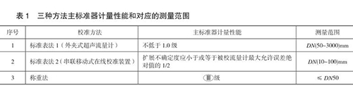 本規(guī)范包含三種校準(zhǔn)方法,分別為標(biāo)準(zhǔn)表法 1(外夾式超聲流量計)、標(biāo)準(zhǔn)表法 2(串聯(lián)移動式在線校準(zhǔn)裝置)和稱重法,編制組對每種方法進行了大量的實驗,并積極與丙酮流量計生產(chǎn)廠家及用戶溝通探討,積累了豐富的經(jīng)驗,獲得了大量的實驗數(shù)據(jù),*終確定三種方法的主標(biāo)準(zhǔn)器計量性能和對應(yīng)的測量范圍,如表 1 所示。