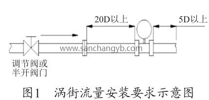 根據(jù)圖1渦街流量安裝要求示意圖及廠家的設(shè)備說明書要求,流量計上游的直管段長度至少為20D≈1 600mm,下游的直管段至少在5D≈400mm,D=80mm 為管道直徑。圖2為現(xiàn)場安裝圖,流量計上游僅為600mm <1 600mm,此流量計安裝位置有誤,對測量值有一定的影響,造成測量偏差,需調(diào)整流量計的安裝位置。