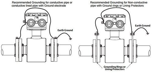 晶片式流量管:將晶片式流量管安裝在非金屬,塑料,PVC或帶襯里的工藝管道之間時(shí),需要接地環(huán)。必須通過將隨附的隨附的SG連接線連接到接地環(huán),將SG傳遞到流量管的主體/外殼上(圖6.)。