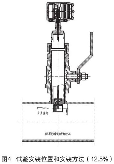 根據(jù)中華人民共和國機(jī)械行業(yè)標(biāo)準(zhǔn):JB/T9249-2015《煙氣流量計(jì)》進(jìn)行氣體渦輪流量計(jì)的研制與設(shè)計(jì)。在試驗(yàn)過程中,因?yàn)槔碚撗芯坎怀浞郑偌由辖?jīng)驗(yàn)不足,采用插入深度是按照以往其它產(chǎn)品(插入式電磁流量計(jì))的經(jīng)驗(yàn),以插入深度為現(xiàn)場(chǎng)管道內(nèi)徑的 12.5% 進(jìn)行試驗(yàn),其對(duì)介質(zhì)流量的檢測(cè)值與同種規(guī)格管道法蘭式結(jié)構(gòu)的煙氣流量計(jì)進(jìn)行比較,偏差值較大、儀表準(zhǔn)確度無法滿足設(shè)計(jì)要求。試驗(yàn)安裝位置和安裝方法如圖 4 所示。