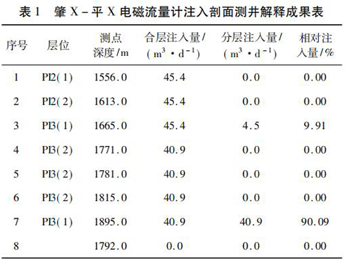 2017 年 9 月在大慶油田采油八廠肇 X - 平 X 水平井注水井中*次進行了水平井注入剖面測井現(xiàn)場試驗。該井斜深2 055. 42 m,水平段長度為568. 46 m,試驗?zāi)康氖峭ㄟ^注入剖面測井了解該井各層段的注水情況,同時對水平井測井工藝、儀器的適用性、井下牽引器及井口輔助裝置等設(shè)備的工作有效性和可靠性進行評價?,F(xiàn)場試驗中,在密閉條件下錄取到了該井的注入剖面測井資料,進行了重復(fù)測量,重復(fù)測量結(jié)果在誤差允許范圍內(nèi),測井成果見表 1。該井施工壓力 6. 0 MPa,注入量45. 4 m3 /d,有 7 個射孔層,分 8 個測點測量,2 個層有吸入顯示,其中,P13( 1) ( 1 734 ~ 1 767 m) 層絕對吸入量4. 5 m3 /d,相對吸入量為9. 91 %,P13( 1) ( 1 899 ~1 943 m)層絕對吸入量 40. 9 m3 /d,相對吸入量為 90. 09% ,測井成果見表 1。通過與甲方的交流,再結(jié)合該井的動靜態(tài)資料及周圍井的工作狀況,采油廠的地質(zhì)人員認為本次測井結(jié)果能比較準(zhǔn)確地反映該井的注入情況。