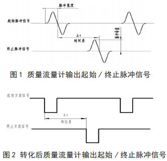 將高壓電磁流量計(jì)流量與相關(guān)測(cè)試設(shè)備連接起來,就可以進(jìn)行高壓電磁流量計(jì)的校準(zhǔn),時(shí)間差△ t 由專用試驗(yàn)測(cè)試設(shè)備可以測(cè)出。起始脈沖信號(hào)和終止脈沖信號(hào)如圖 1 所示。經(jīng)過專用試驗(yàn)測(cè)試設(shè)備信號(hào)轉(zhuǎn)化后的信號(hào)方波如圖 2 所示。