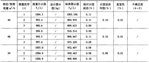 表1是用容積法現(xiàn)場(chǎng)檢測(cè)流量計(jì)后,電腦自動(dòng)生成的原始記錄數(shù)據(jù)頁(yè)部分,表2是用質(zhì)量法現(xiàn)場(chǎng)檢測(cè)流量計(jì)后,電腦自動(dòng)生成的原始記錄數(shù)據(jù)頁(yè)部分。