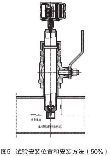 對插入式渦街流量計(jì)和插入式電磁流量計(jì)的結(jié)構(gòu)原理進(jìn)行分析,插入式電磁流量計(jì)的信號(hào)采集點(diǎn)在標(biāo)校管道內(nèi)12.5% 為宜,因它屬電磁類流量計(jì),而流量計(jì)是根據(jù)“卡門渦街”原理進(jìn)行測量管道內(nèi)流量,根據(jù)標(biāo)校管道內(nèi)層流和湍流的分析,以及流量計(jì)獨(dú)特的探頭結(jié)構(gòu)形式,確定煙氣流量計(jì)的插入深度為標(biāo)校管道內(nèi) 50%,試驗(yàn)安裝位置和安裝方法如圖 5 所示。