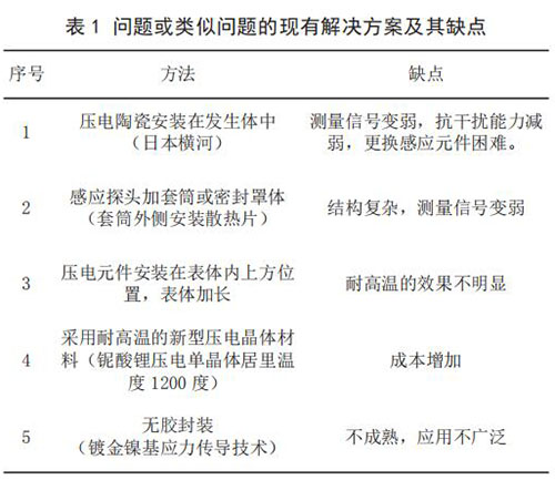 3) 當(dāng)前技術(shù)系統(tǒng)存在的問題。 由于目前使用的傳感器檢測感應(yīng)元件為壓電陶瓷,其極化時居里溫度大約420 ~ 460℃,因此只能在低于 240℃介質(zhì)中使用,一旦被測量介質(zhì)的溫度高于 240℃,液態(tài)液化氣流量計傳感器便會因壓電陶瓷達到居里點,絕緣電阻降低,壓電信號變?nèi)醵А?br /> 4)問題或類似問題的現(xiàn)有解決方案及其缺點(見表 1)。