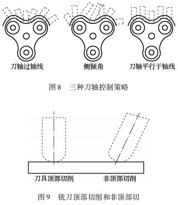 四軸加工中采用球頭銑刀,刀軸控制策略是提高加工效率和轉(zhuǎn)子曲面表面粗糙度的關(guān)鍵。如圖 8所示,刀軸控制策略有常見的刀軸過軸線、側(cè)傾角、刀軸平行于軸線。筆者采用平行軸線銑削加工方式對這 3 種刀軸控制策略進行實際加工對比,得出采用側(cè)傾角刀軸控制策略加工出的轉(zhuǎn)子曲面表面粗糙度*好。其原因主要由于刀軸平行于軸線這種刀軸控制策略采用球頭銑刀加工時,其刀具切削轉(zhuǎn)子曲面時的接觸點為刀具的頂部,球頭銑刀的頂部直徑為零,線速度也為零。此時刀具是在擠壓工件,刀具頂部也容易磨損。刀軸過軸線策略雖然刀具與轉(zhuǎn)子曲面的接觸點一直在變換,但是也有刀位點是采用刀具頂部去切削。側(cè)前傾角刀軸控制策略: 控制刀具與轉(zhuǎn)子曲面接觸點的位置,避免球頭銑刀頂部銑削轉(zhuǎn)子曲面,實現(xiàn)刀尖的點的偏離,提高刀具切削點的線速度。球頭銑刀頂部切削和非頂部切削如圖 9 所示。