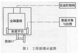 本裝置采用容積法和稱重法相結(jié)合的工作原理。對于質(zhì)量流量計(jì),采用稱量法直接比較,確定流量計(jì)的誤差。上裝放油閥防溢出控制系統(tǒng),采用液位動(dòng)態(tài)監(jiān)視,一旦超過容器安全液位高度,即可切斷發(fā)油動(dòng)力。在運(yùn)輸防震或非測量狀態(tài)時(shí),對秤進(jìn)行與稱重容器的脫離操作,保證稱重的可靠性。在稱重狀態(tài)時(shí),需要對枰進(jìn)行調(diào)平和清零,此部分采用動(dòng)態(tài)水平的方式進(jìn)行,即以水平位一致的方法調(diào)整稱重平臺(tái)。工作原理如圖1所示。