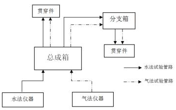 安全殼渦街蒸汽流量計以總成箱和分支箱為核心。試驗初期,將總成箱置于儀器放置區(qū),分支箱置于貫穿件集中區(qū)域附近,檢漏儀至總成箱再至分支箱之間的管線固定連接,如圖2所示。水法試驗管路與氣法試驗管路互相獨立,總成箱和分支箱的每一路連接采用編號標(biāo)記進(jìn)行區(qū)分,并設(shè)置控制閥控制開關(guān)和流向。