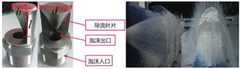 圖 1 為電弧風(fēng)扇噴嘴的結(jié)構(gòu)和噴霧,一種新型的噴嘴主要由一個(gè)智能渦街流量計(jì)入口、出口和導(dǎo)流葉片組成。出流口的圓柱形設(shè)計(jì)降低了湍流強(qiáng)度。導(dǎo)流葉片類似于流線型尾部,產(chǎn)生類似于弧形風(fēng)扇形狀的智能渦街流量計(jì)噴霧,其形狀類似于掘進(jìn)機(jī)的粉塵源。