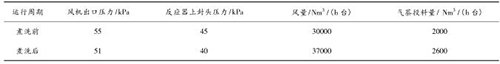 液體渦街流量計(jì)煮洗吹掃后,裝置運(yùn)行期間無(wú)燃爆事故,且裝置運(yùn)行的風(fēng)量明顯提高,系統(tǒng)阻力明顯降低,投料量增加。現(xiàn)將煮洗前后的運(yùn)行數(shù)據(jù)對(duì)比如下: