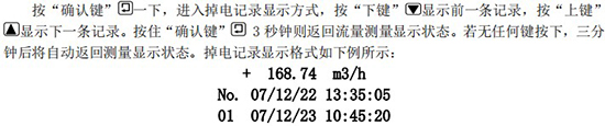 該記錄表示:*一條掉電記錄(No.1),停電時(shí)間為 07 年 12 月 22 日 13 點(diǎn) 35 分 05 秒,重新上電時(shí)間為 07 年 12 月 23 日 10 點(diǎn) 45 分 20 秒,掉電時(shí)的瞬時(shí)流量為 168.74m3/h,該次掉電時(shí)間長度為 21 小時(shí) 10 分鐘。