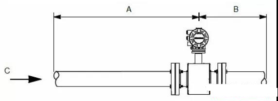 為了確保過程條件大幅度變化的情況下的規(guī)定精度,安裝傳感器時,在電極平面上游留出至少五倍管徑長度的直管段,在電極平面下游留出至少兩倍管徑長度的直管段。