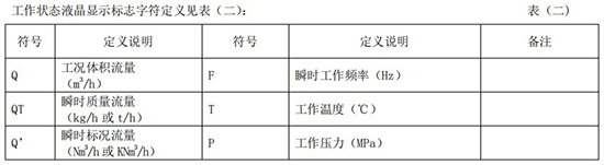 工作狀態(tài)液晶顯示標志字符定義見表(二):