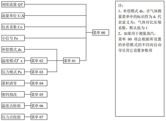 3.1、本儀表表頭采用自導引式和菜單式相結合的參數(shù)設置方式,所謂自導引式參數(shù)設置方式就是用戶在進入菜單 00 項后,表頭中的微電腦會自動導引用戶去設置需要設置的參數(shù)。另外,用戶也可以通過菜單模式分別對各組參數(shù)進行設置。蒸汽測量菜單框圖如下: