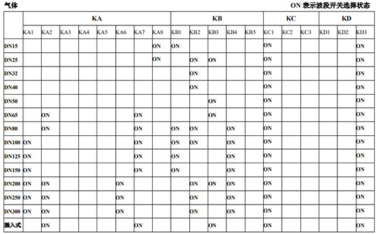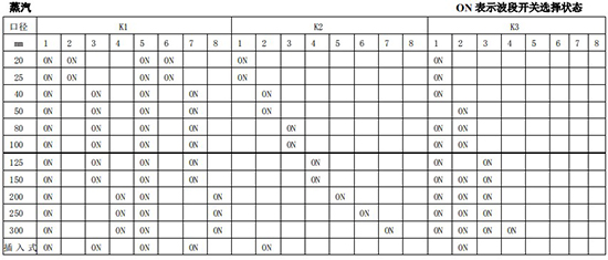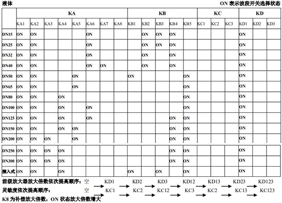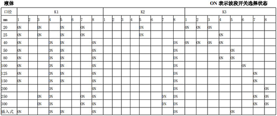 以上表值僅供參考,實際使用中因液體粘度和氣體密度不同應在此值附近調(diào)整,頻率低時可將 K3 向大口徑方向調(diào)一至三檔。頻率高時可將 K2 向小口徑方向調(diào)一至三檔。