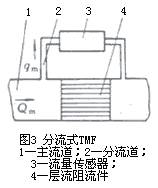 為了獲得良好的線形輸出,必須保持層流流動,測量管內(nèi)徑d設(shè)計得很小而長度l很長,即有很大l/d比值,流速低,流量小。為擴(kuò)大儀表流量,還可采用在管道內(nèi)裝管束等層流阻流件;擴(kuò)大更大流量和口徑還常采用分流方式,在主管道內(nèi)裝層流阻流件(見圖3)以恒定比值分流部分流體到流量傳感部件。有些型號儀表也有用文丘里噴嘴等代替層流阻流件。