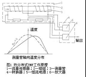 熱分布式tmf的工作原理如圖1所示,薄壁測量管3外壁繞著兩組兼作加熱器和檢測元件的繞組2,組成惠斯登電橋,由恒流電源5供給恒定熱量,通過線圈絕緣層、管壁、流體邊界層傳導熱量給管內流體。邊界層內熱的傳遞可以看作熱傳導方式實現(xiàn)的。在流量為零時,測量管上的溫度分布如圖下部虛線所示,相對于測量管中心的上下游是對稱的,由線圈和電阻組成的電橋處于平衡狀態(tài);當流體流動時,流體將上游的部分熱量帶給下游,導致溫度分布變化如實線所示,由電橋測出兩組線圈電阻值的變化,求得兩組線圈平均溫度差δt。便可按下式導出質量流量qm,即