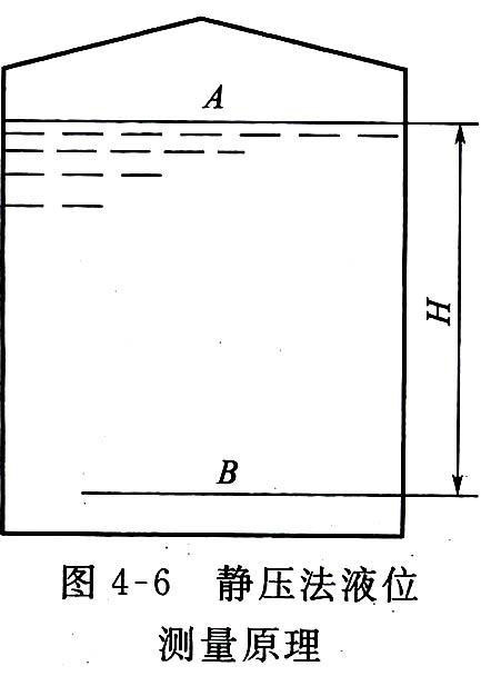 由式(4—8)和式(4—9)可知,液體任何一點的壓力等于其表面壓力加上液體密度與重力加速度及液柱高度的乘積。液體的靜壓力是液位高度和液體密度的函數(shù),當(dāng)液體的密度為常數(shù)時,A、B圖4—6靜壓法液位測量原理兩點的壓力或壓差僅與液位高度有關(guān)。因此可以通過測量P或Ap來實現(xiàn)液位高度的測量。這樣液位高度的測量就變?yōu)橐后w的靜壓測量,凡是能夠測量壓力或壓差的儀表,只要量程合適均可用于液位測量。