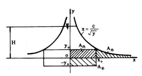 即縱坐標(biāo)y值趨近于零時(shí),橫坐標(biāo)x值趨近無(wú)窮大。這在堰板的實(shí)際制作上是無(wú)法實(shí)現(xiàn)的。若將堰口曲線的*低縱坐標(biāo)取為yo,在yo一下至(-yo)增開(kāi)一矩形,即高為2yo,寬為2x。的補(bǔ)償孔,從數(shù)學(xué)上可以證明,坐標(biāo)原點(diǎn)以下所增大的矩形面積(A補(bǔ))正好等于舍去的曲邊面積(A補(bǔ))。由圖3可知