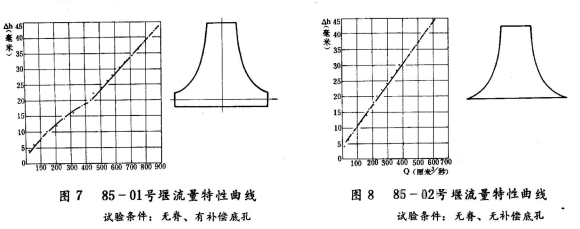 用85-01號(hào)和85-02號(hào)兩種雙曲線薄壁堰,在試驗(yàn)水槽端安裝成無(wú)脊有補(bǔ)償孔和無(wú)補(bǔ)償孔兩種情況,進(jìn)行了多次實(shí)驗(yàn),所得數(shù)據(jù)通過(guò)整理,畫(huà)出流量特性曲線,見(jiàn)圖7和圖8。
