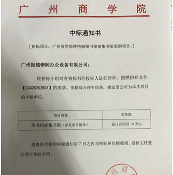 四月份我司收到了廣州商學院采購項目的投標邀請,振越的手動密集架不僅仍然堅持使用了正規的加厚板材,采用優質冷軋鋼,環保健康,不會有異味和環境污染,最先進的靜電噴塑工藝,加上熟練工人師傅一絲不茍的折彎,焊接,酸洗等十幾道工序,密集架表面光滑潔凈,光澤度均勻,一看就非常高檔?烧{節的層板設計,合理分層,更適合儲存量的需要,拿取方便。除此之外,廣州振越資質健全,品牌深受市場喜愛已久。不僅內貿銷量很好,外貿也將生意做到全球,深受國際市場的青睞。校方對這些都非常的滿意和認可。最終,廣州振越密集架因為標書詳盡,產品質量過硬而被校方確定中標。