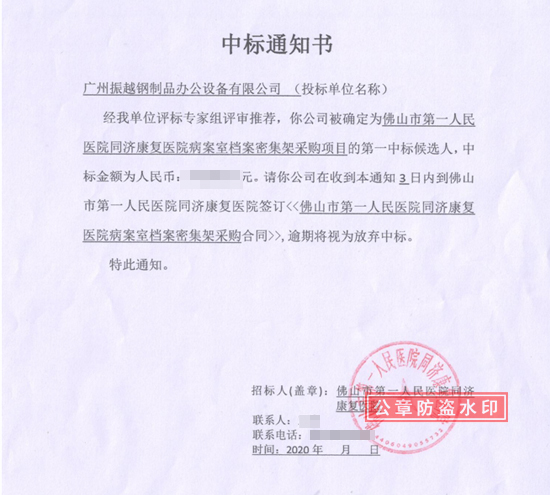經過公司專業團隊制作標書,密封完整后遞交給了醫院招標部,再陸續經過醫院招標辦專家各方面綜合對比,最終得出由我公司廣州振越鋼制辦公設備有限公司中標。在中標后的2個工作日內,我公司安排了專業的人員勘察現場,經過現場實地測量勘察,現場尺寸符合醫院招標要求,可按照招標要求生產密集架尺寸。